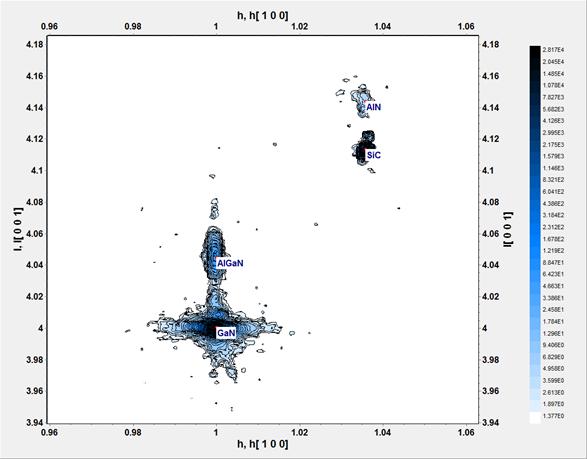 Возможности рентгеновского дифрактометра Bruker D8 Discover позволяют осуществлять съемку одномерных и двумерных (карт обратного пространства) сканов в режиме высокого разрешения. Эти возможности были реализованы в методиках анализа гетероэпитаксиальных структур на основе GaN. Комбинация картирования обратного пространства, съемок кривых качания, одномерных сканов в высоком разрешении и кривых малоугловой рефлектометрии позволяет наиболее полно охарактеризовать структурные свойства HEMT структур на основе GaN: толщины и составы слоёв, степень релаксации и остаточные упругие напряжения, ширины кривых качания и плотности прорастающих дислокаций, контроль толщины пассивирующих и контактных слоёв.