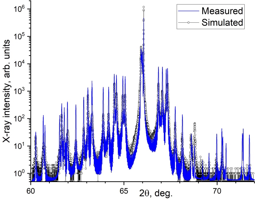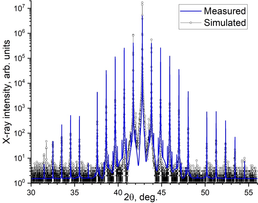 Рентгеновский дифрактометр Bruker D8 Discover в высокоразрешающей конфигурации, а также имеющееся программное обеспечение для моделирования кривых дифракционного отражения с помощью динамической теории дифракции рентгеновских лучей позволяют выполнять анализ и подгонку дифракционных кривых для сверхмногопериодных гетероструктур квантовых каскадных лазеров. Освоены методики определения флуктуаций ростового процесса, отклонений от периодичности. Наложение связей на подгоняемые параметры структуры позволяет проводить уточнение непосредственно скоростей роста слоев отдельных материалов.