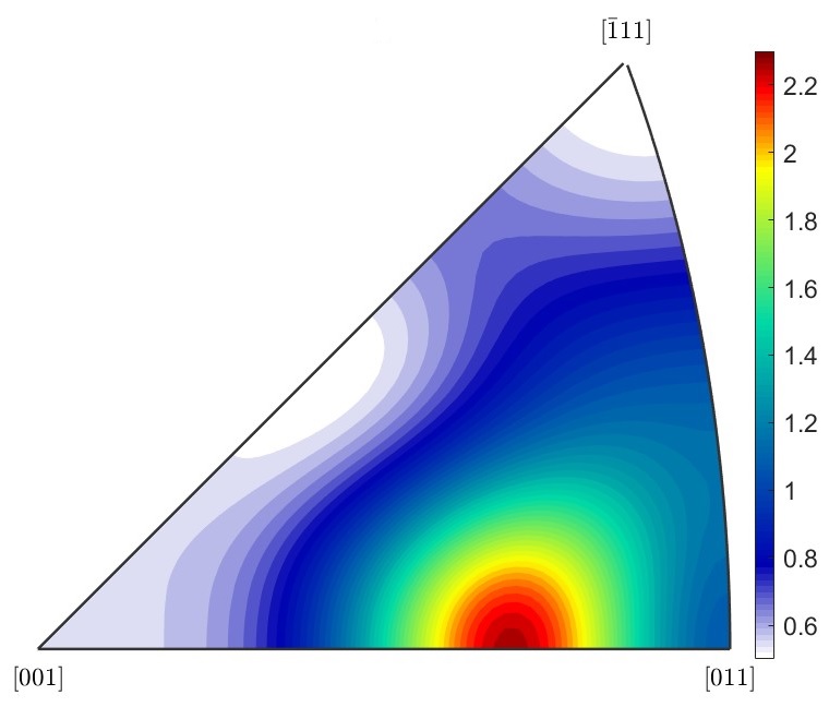С использованием эйлеровой подвески на дифрактометре Bruker D8 Discover в схеме низкого разрешения проведен текстурный анализ медных дисков и облицовок, полученных методом сферодвижной штамповки. Построены прямые полюсные фигуры для различных дифракционных отражений меди. Проведен их анализ, построены функция распределения ориентаций и обратная полюсная фигура. Определено, что образец представляет собой осевую текстуру с осью текстуры вдоль направления [530].