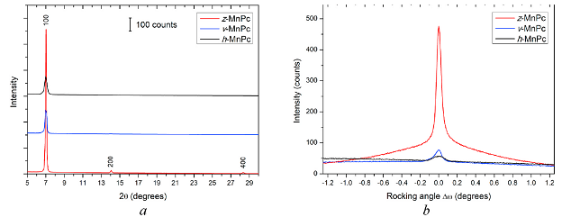Рентгенодифракционный анализ тонких пленок фталоцианина марганца, осажденных в различных конфигурациях внешнего магнитного поля: а – θ/2θ сканирование, b – кривые качания, позволяющие оценить степень кристаллического текстурирования в пленке